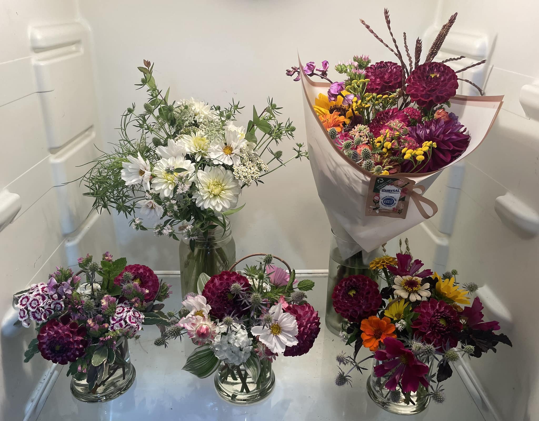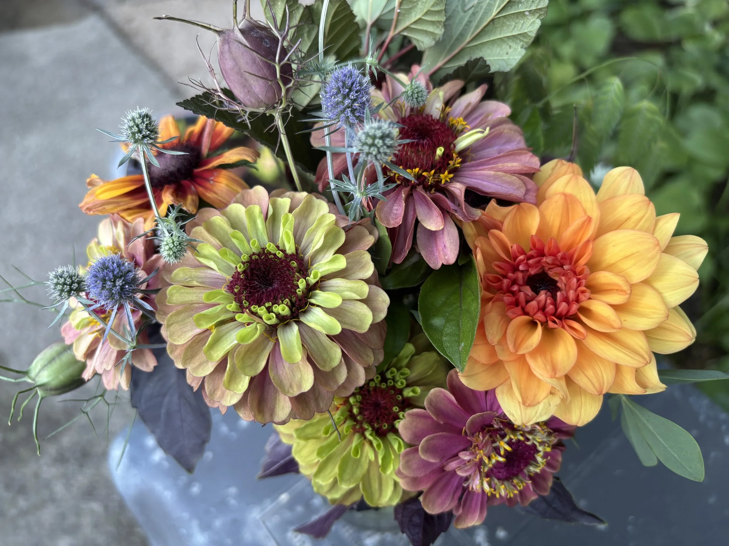 All bouquets are grown right here in Hancock County. No international transport or wasteful packaging required. They were nurtured and harvested and then delivered without leaving their bucket.